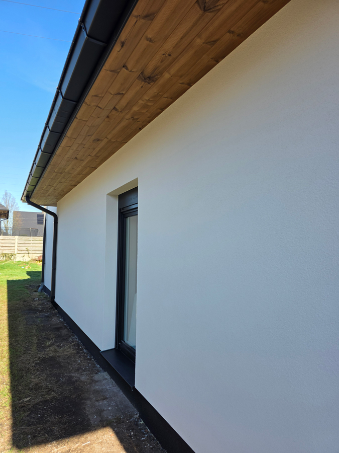 Onderaan werkten we met een robuuste, vochtbestendige opbouw: zwarte granulaatpleister op XPS als plintafwerking. Die combinatie beschermt het onderste deel van de gevel tegen opspattend water en vuil, en zorgt tegelijk voor een mooi contrast met de lichte crepi. Zo krijgt de gevel een duidelijke, moderne sokkellijn.