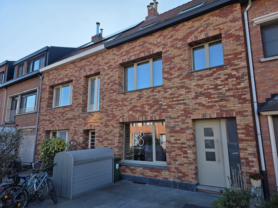 De voorgevel werd geïsoleerd met 14 cm EPS en afgewerkt met steenstrips zonder voeg. Dat zorgt voor een strakke, authentieke baksteenlook met een moderne toets. De plint en raamdorpels in blauwe steen versterken het premium karakter en bieden extra bescherming op de meest belaste zones van de gevel.
